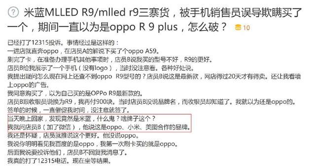 由于外形高仿,米藍R9還被銷售員當成OPPO R9在線下賣過,店員還忽悠稱米藍是“OPPO、小米、美圖的合作品牌”。