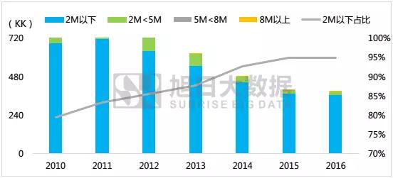 反觀功能機(jī)手機(jī)攝像頭,低端像素市場(chǎng)在功能機(jī)這邊卻占據(jù)著舉足輕重的位置。據(jù)旭日大數(shù)據(jù)統(tǒng)計(jì),功能機(jī)手機(jī)攝像頭像素幾乎為5M以下像素的低端像素手機(jī)。并且2M以下像素份額占比在逐年加大,從2010年接近80%上到2016年的90%左右。功能機(jī)才用低端像素,并且像素有逐年減低的趨勢(shì),主要原因是由于功能手機(jī)的已逐漸向通訊功能轉(zhuǎn)移,而對(duì)攝像頭像素需求漸弱。
