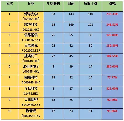 在上述十大牛股中,其中漲幅超過兩倍的有丘鈦科技、比亞迪電子和舜宇光學(xué),三者均為港股,漲幅超過一倍的有瑞聲科技、信維通信、大族激光、建滔化工,漲幅接近一倍的有立訊精密、歐菲光以及聞泰科技!