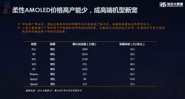 而在產(chǎn)業(yè)鏈方面,李春麗則認(rèn)為,柔性AMOLED價(jià)格高產(chǎn)能少,會(huì)成高端機(jī)型新寵。柔性AMOLED在異形切割方面難度小,速度快,良率高,因此柔性AMOLED在全面屏方面有天生的優(yōu)勢(shì)。而國(guó)產(chǎn)品牌廠商面臨著兩個(gè)難題:一個(gè)是柔性AMOLED產(chǎn)能不足,目前OPPO和vivo是三星AMOLED屏的主要使用者,但只有vivo的xplay系列有用到柔性的AMOLED屏,而且從這兩代手機(jī)的出貨量來(lái)看,其量也不大。另一個(gè)問(wèn)題是價(jià)格高,根據(jù)旭日大數(shù)據(jù)的監(jiān)測(cè),OPPO和vivo用于中高端機(jī)型上的剛性AMOLED屏價(jià)格在34到43美金之間,但柔性AMOLED的價(jià)格比剛性的價(jià)格要翻番。Xplay5的柔性AMOLED平均價(jià)格高達(dá)93美金,雖然xplay6的有所下降,但依然高達(dá)72美金。加上異形切割的成本,因此她認(rèn)為柔性AMOLED的全面屏手機(jī)將會(huì)是明年高端機(jī)型的新寵。