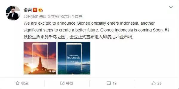 繼11月26日金立發(fā)布8款全面屏之后,今天金立集團(tuán)副總裁俞雷在微博宣布:科技悅生活來到千島之國(guó),金立正式宣布進(jìn)入印度尼西亞市場(chǎng)。