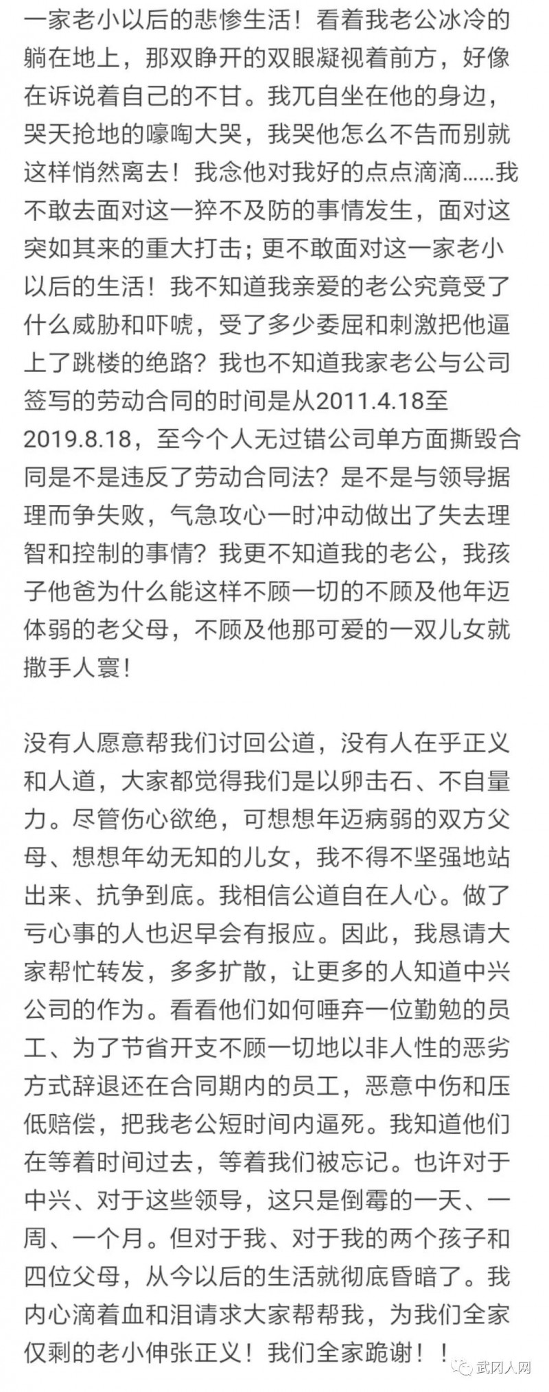 我曾經(jīng)有個美滿幸福的家庭,老公忠厚善良、一對兒女乖巧聽話??墒?2月10日這天他竟突然在中興研發(fā)大樓墜樓當(dāng)場死亡。我們的家庭支柱倒了,留下我和9歲的兒子以及2歲的女兒、四個年邁的老人茫然失措,讓我天崩地裂??!完全不知將來該怎么辦?怎么辦?