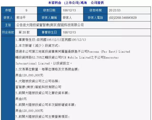 其中注冊成立富智康(南京)智能科技有限公司,注資總額約為1.2億美元。注冊成立富智康電子科技(南京)有限公司,注資總額約為2.5億美元。