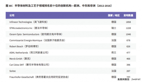 從半導(dǎo)體材料及工藝子領(lǐng)域歐洲、中東和非洲十大創(chuàng)新機(jī)構(gòu)(2012-2016)榜單可以看到,英飛凌科技占據(jù)榜首,該公司在 2012 到 2016 年的發(fā)明數(shù)量為 1858 件。其中,德國共有六家機(jī)構(gòu)入圍(包括英飛凌、歐司朗光電、羅伯特博世、默克、蔡司半導(dǎo)體和弗勞恩霍夫應(yīng)用研究促進(jìn)協(xié)會),其次是法國(CEA 和 Soitec),瑞士(意法半導(dǎo)體)和荷蘭(ASML)。