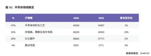 半導(dǎo)體主要分為半導(dǎo)體材料及工藝、存儲器、薄膜及混合電路、集成電路、分立器件這四個子領(lǐng)域,而從這四個子領(lǐng)域 2016 年的創(chuàng)新活動來看,“存儲器、薄膜及混合電路”的增幅最大,達(dá)到了 19%;其次是“集成電路”,增幅達(dá)到 5%;而“分立器件”和“半導(dǎo)體材料及工藝”的增幅分別是 2% 和 1%。