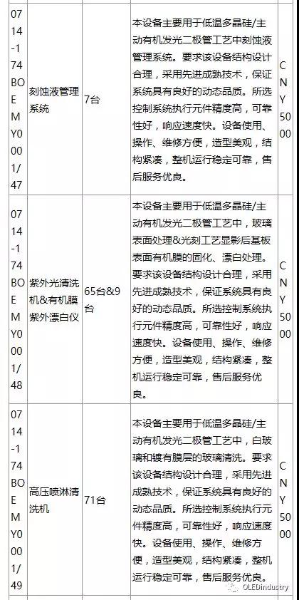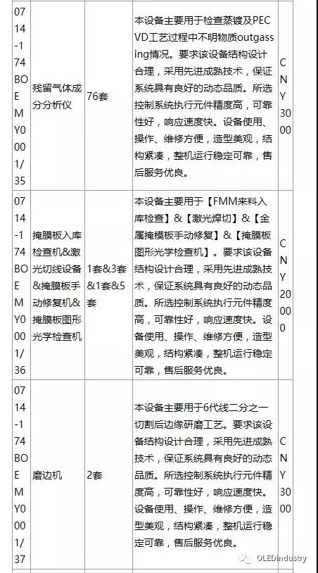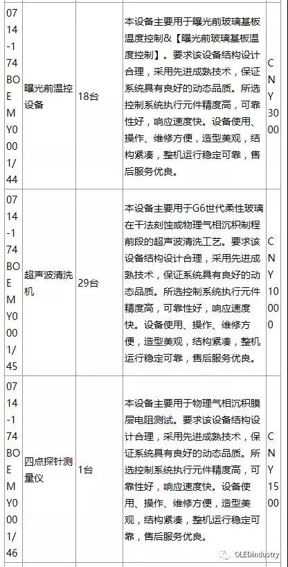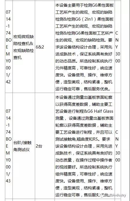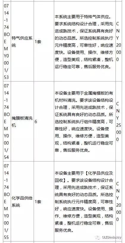 綿陽(yáng)京東方第6代AMOLED(柔性)生產(chǎn)線(xiàn)招標(biāo)產(chǎn)品列表(主要設(shè)備):