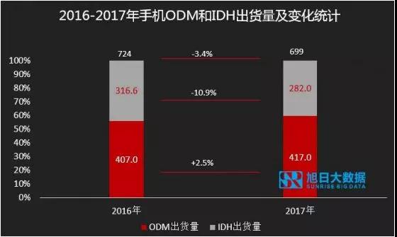 從不同研發(fā)方案來看,2017年ODM市場需求有輕微增長,IDH市場需求在明顯下降。ODM的出貨量同比增長超過2.5%至約4.17億部,而IDH的出貨量卻同比下降超過10%。