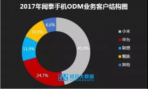 從客戶結(jié)構(gòu)看,2017年,聞泰的主要客戶是小米、華為、聯(lián)想和魅族,聞泰的主要客戶基本囊括了目前主流的大品牌。根據(jù)旭日大數(shù)據(jù)的統(tǒng)計,2017年,小米是聞泰的最大客戶,在聞泰中的出貨量超過3700萬部,占據(jù)聞泰手機ODM業(yè)務的占比超過45%,其次,華為是聞泰的第二大客戶,在聞泰中的出貨量超過2000萬部,占據(jù)聞泰手機ODM業(yè)務的占比接近25%。
