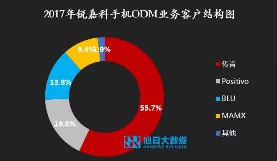 根據(jù)旭日大數(shù)據(jù)的統(tǒng)計,2017年,傳音是銳嘉科的最大客戶,出貨量約300萬部,占據(jù)銳嘉科手機ODM業(yè)務的占比約56%,其次,均為海外客戶。