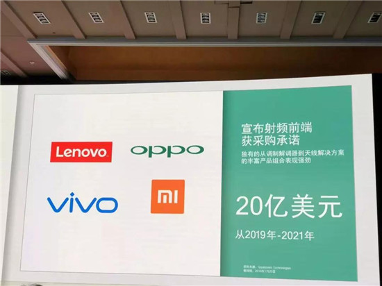 2017年11月,高通與OPPO、vivo、小米簽訂120億美元的高額訂單(三年內(nèi)),2018年1月25日,高通再次與OPPO、vivo、小米、聯(lián)想簽訂20億美元的高額訂單,主要采購產(chǎn)品為射頻前端,并且不在120億美元的訂單內(nèi)!
