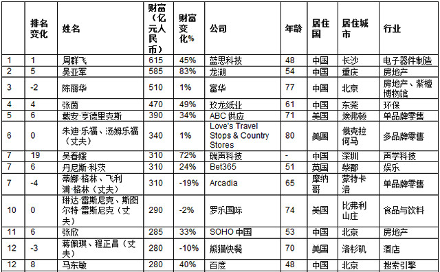 前十中一半來自中國,周群飛成為全球白手起家女首富。3人新進(jìn)前十:美國最大屋頂與墻面批發(fā)分銷商ABC Supply的戴安·亨德里克斯、“手機喇叭女王”瑞聲科技的吳春媛,以及英國在線博彩公司Bet365的丹尼斯·科茨。