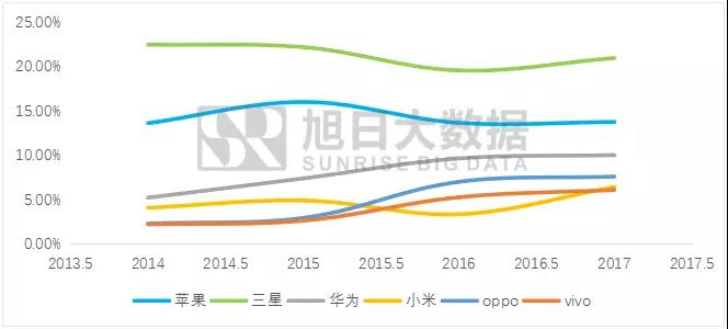 2014-2017年中國手機(jī)品牌市占率穩(wěn)步上升