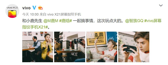值得一提的是,此條微博還強(qiáng)調(diào),“搞事情”的除了鹿晗還有vivo。在微博的四張圖中,每一張都離不開三個(gè)關(guān)鍵元素——鹿晗、vivo X21屏幕指紋版和拍照。這是否意味著,鹿晗GQ大片將全程用vivo X21屏幕指紋版拍攝呢?