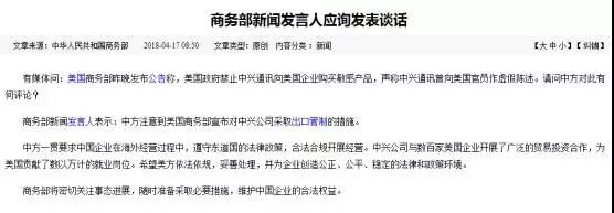 同時,17日上午,商務(wù)部新聞發(fā)言人表示:中方注意到美國商務(wù)部宣布對中興公司采取出口管制的措施。中方一貫要求中國企業(yè)在海外經(jīng)營過程中,遵守東道國的法律政策,合法合規(guī)開展經(jīng)營。中興公司與數(shù)百家美國企業(yè)開展了廣泛的貿(mào)易投資合作,為美國貢獻了數(shù)以萬計的就業(yè)崗位。希望美方依法依規(guī),妥善處理,并為企業(yè)創(chuàng)造公正、公平、穩(wěn)定的法律和政策環(huán)境。商務(wù)部將密切關(guān)注事態(tài)進展,隨時淮備采取必要措施,維護中國企業(yè)的合法權(quán)益。
