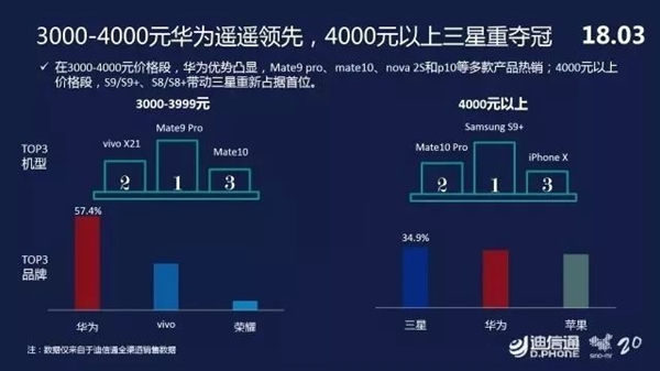 而在3000-400元價位中,華為優(yōu)勢明顯,TOP3機型分別為:華為Mate 9 Pro、華為Mate 10以及vivo X21;4000元以上價位,三星S9+、華為Mate 10 Pro以及iPhone X是最熱銷的三款機型。