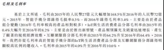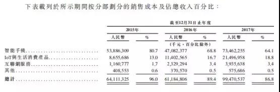 從銷售成本來(lái)看的話,同樣是手機(jī)業(yè)務(wù)的成本最高,不過(guò),從2015年到2017年處于下降的趨勢(shì),但占比依然達(dá)到了64.1%,其次是IOT與生活消費(fèi)產(chǎn)品,這一部分的成本反而呈現(xiàn)上升趨勢(shì)!