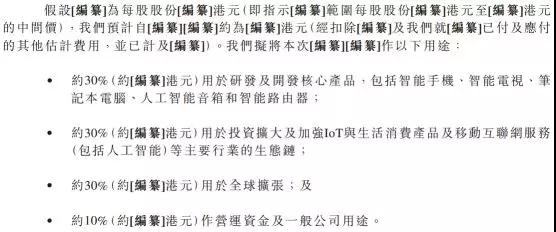 小米計(jì)劃將30%的IPO募集資金用于研發(fā)及開(kāi)發(fā)智能手機(jī)、電視、筆記本電腦、人工智能音響等核心產(chǎn)品;30%用于擴(kuò)大投資及強(qiáng)化生活消費(fèi)品與移動(dòng)互聯(lián)網(wǎng)產(chǎn)業(yè)鏈;30%用于全球擴(kuò)展;10%用作一般營(yíng)運(yùn)用途。