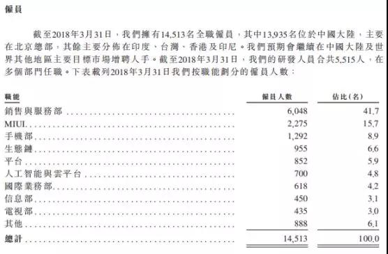 從小米的部門組織結(jié)構(gòu)以及人員方面來(lái)看,其目前已經(jīng)在全球有14513名員工,其中大陸有13935名員工,主要包括銷售與服務(wù)部、MIUI部、手機(jī)部、生態(tài)部、平臺(tái)、人工智能與云平臺(tái)、國(guó)際實(shí)業(yè)無(wú)、信息部、電視部以及其他部門!其中銷售與服務(wù)部人員達(dá)到了6048名,占比高達(dá)41.7%!