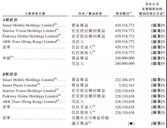根據(jù)招股說(shuō)明書,小米采用同股不同權(quán),分為兩類股份權(quán)利,A類股份美股可投10票,B類股份每股投一票。A類股份受益人為雷軍和林斌。