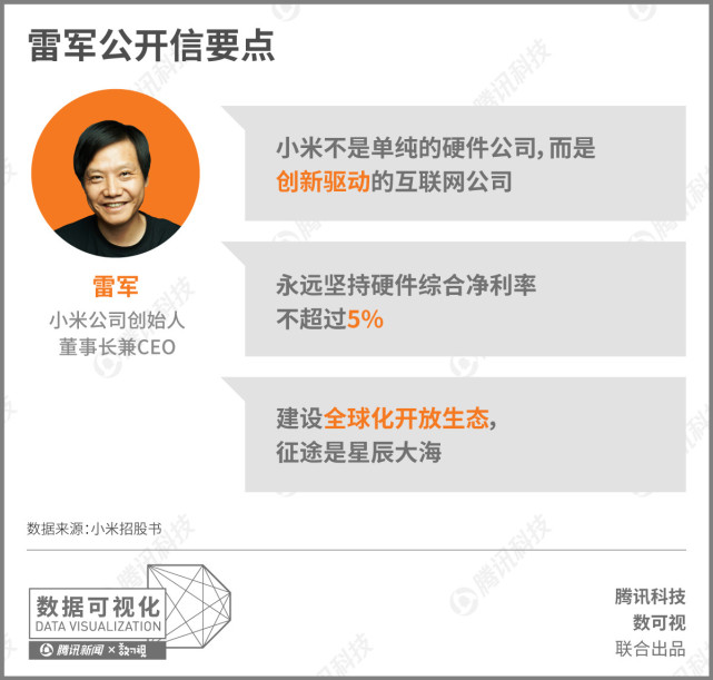 雷軍發(fā)布公開信,稱小米不是單純的硬件公司,而是創(chuàng)新驅(qū)動(dòng)的互聯(lián)網(wǎng)公司,并且強(qiáng)調(diào),永遠(yuǎn)堅(jiān)持硬件綜合凈利率不超過5%。