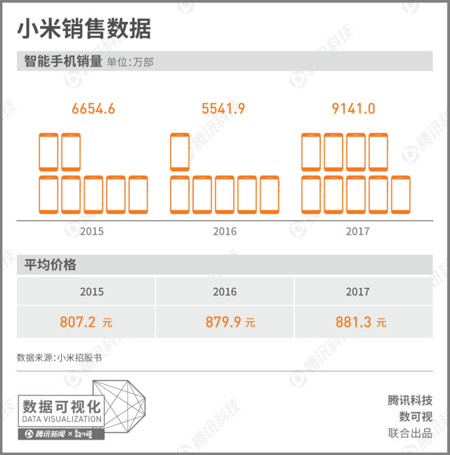 核心智能手機(jī)產(chǎn)品銷量方面,2015年至2017年,小米先后分別銷售了6654.6萬部、5541.9萬部和9141萬部,對應(yīng)的平均價(jià)格分別為807.2元、879.9元和881.3元。
