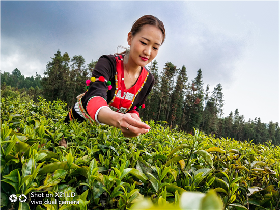 倘若在逆光場景下拍人,那vivo X21還會疊加AI美顏,拍出美麗自然的逆光人像。亦如下圖,云南妹子采摘茶葉,逆光之下給人別樣韻味,美顏過后顯得靈動而富有活力。