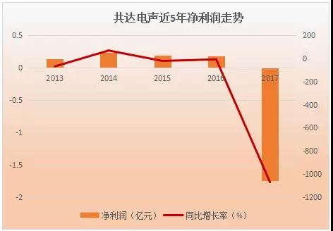 事實上,縱觀共達(dá)電聲近幾年的業(yè)績狀況,可謂是非常慘淡。從2013年到2017年,其營收分別為:5.07億元、6.54億元、7.05億元、7.16億元、7.87億元;其凈利潤分別為:0.14億元、0.24億元、0.19億元、0.18億元、-1.75億元。