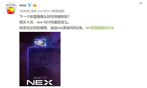 6月1日,vivo官方微博正式宣布其新一代旗艦——vivo NEX將于6月12日在上海發(fā)布。微博中還有“突破未來之作”、“AI智慧旗艦”等字樣,可見vivo NEX在設(shè)計及AI功能上都有了新的突破。那么vivo NEX到底是一款什么樣的未來手機呢?