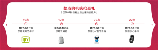 在6月8日當(dāng)天,天貓整點(10點、12點、20點、22點)購機(jī)贈好禮,好禮有愛奇藝年卡、雙肩包、小V藍(lán)牙音箱以及樂心手環(huán)等。