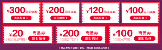 同時,還有搶券立減福利,天貓券和商品券一應(yīng)俱全,最高壕減300 元!