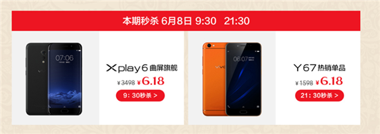 除了立減外,vivo還為消費者帶來拼手速碰運氣的非凡秒殺活動,爆款機(jī)型XPlay6和Y67炫動橙各6.18元限時秒殺一臺,對!沒錯,就是6.18元,不是美元也不是英鎊,是人民幣!