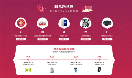 vivo的618活動還在繼續(xù),今天(6月8日),vivo在天貓平臺開展粉絲日活動,給粉絲們帶來更多福利,包括整點購機(jī)贈好禮、爆款機(jī)型6.18元秒殺、世界杯門票贈送、老喜有禮、以舊換新以及vivo專屬花唄提額、100元指定商品卷限量以及618超級抽獎等。