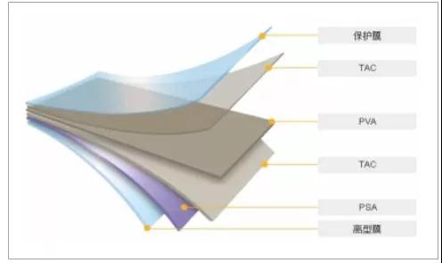 偏光片由多層膜復(fù)合而成,核心膜材 PVA 負(fù)責(zé)偏振作用。偏光片由 PVA 膜,TAC膜,保護膜,離型膜和壓敏膠組成,其中,吸附二向吸收分子的 PVA 膜負(fù)責(zé)偏振作用,是偏光片的核心膜材,決定偏光片的偏光性能,透過率及色調(diào)等關(guān)鍵參數(shù), TAC 膜則起到對延伸的 PVA 膜的支撐和保護。