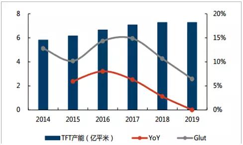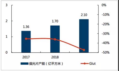 在市場需求的帶動下,全球偏光片產(chǎn)能逐步提升,據(jù)預(yù)測, 2019 年全球偏光片產(chǎn)能有望達到 7.28億平方米, 同時, Glut 值((供給-需求) /需求)為 6.4%,供給略高于需求,供需結(jié)構(gòu)較為良好。