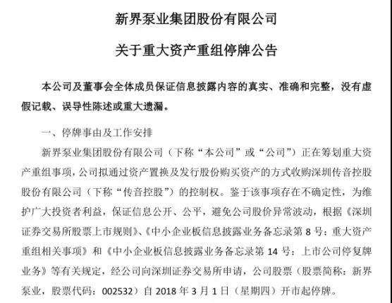 1、傳音終止借殼新界泵業(yè)