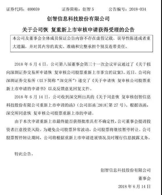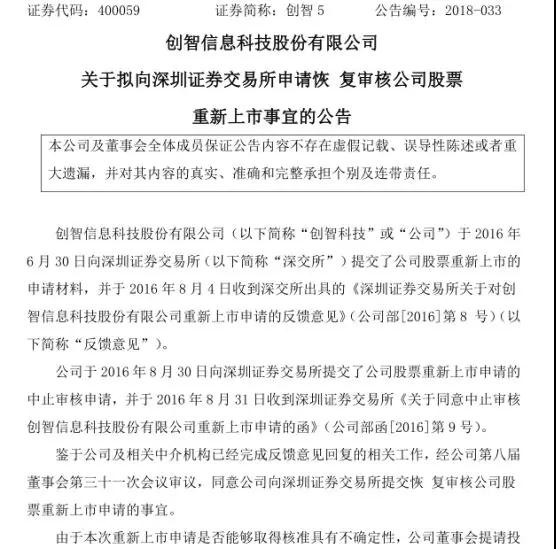2018年6月4日,據(jù)創(chuàng)智5發(fā)布《關(guān)于擬向深圳證券交易所申請恢復(fù)審核公司股票重新上市事宜的公告》內(nèi)容顯示:2016年6月30日,公司向深圳證券交易所提交了公司股票重新上市的申請材料,并于2016年8月4日收到深交所出具的《深圳證券交易所關(guān)于對創(chuàng)智信息科技股份有限公司重新上市申請的反饋意見》。公司于2016年8月30日向深圳證券交易所提交了公司股票重新上市申請的中止審核申請,并于2016年8月31日收到深圳證券交易所《關(guān)于同意中止審核創(chuàng)智信息科技股份有限公司重新上市申請的函》。