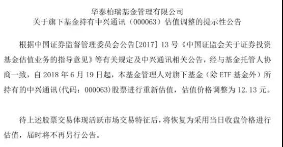 同樣下調(diào)中興通訊估值的還有華泰柏瑞基金,根據(jù)華泰柏瑞基金今日發(fā)布的關(guān)于旗下基金所持證券調(diào)整估值價的公告:根據(jù)中國證券監(jiān)督管理委員會公告[2017] 13號《中國證監(jiān)會關(guān)于證券投資基金估值業(yè)務的指導意見》等有關(guān)規(guī)定及中興通訊相關(guān)公告,經(jīng)與基金托管人協(xié)商一致,自2018年6月19日起,本基金管理人對旗下基金(除ETF基金外)所持有的中興通訊(代碼:000063)股票進行重新估值,估值價格調(diào)整為12.13元。
