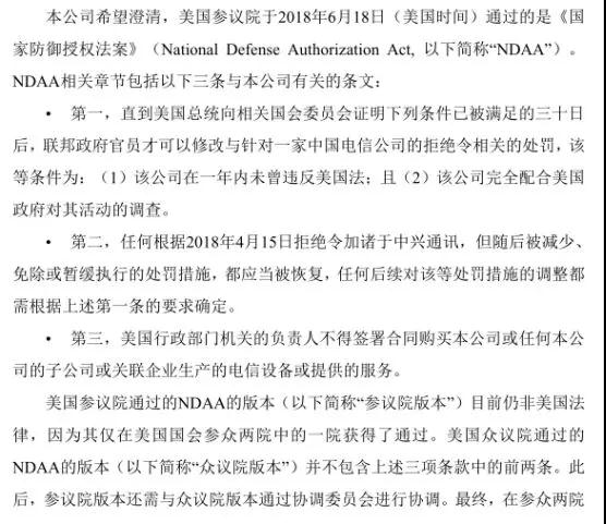 中興通訊稱,美國參議院通過的NDAA的版本仍非美國法律,因為其僅在美國國會參眾兩院中的一院獲得了通過。值得一提的是,在此期間,中美貿(mào)易大戰(zhàn)再次重啟,美國對中國啟動了500億美元產(chǎn)品進口稅,而中國方面同樣對美國進行還擊!