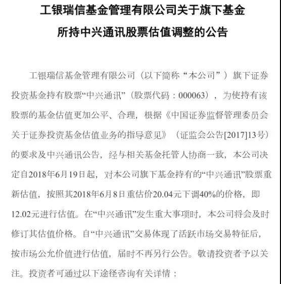 而在此期間,多家基金公司對中興通訊股票的估值進一步調(diào)整,總體是進一步下調(diào)。部分基金已將中興通訊估值下調(diào)至12.02元。富國基金近日公告稱,自2018年6月20日起,對旗下基金持有的“中興通訊”股票進行估值調(diào)整,按照12.02元進行估值。