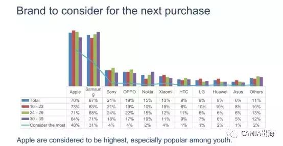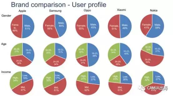 在用戶群體方面,三星女性比例最高,為56%,OPPO在16~23歲年齡段的年輕人比例高達(dá)48%,蘋果的高收入人群比例為34%,高于諾基亞、三星等手機(jī)廠商。