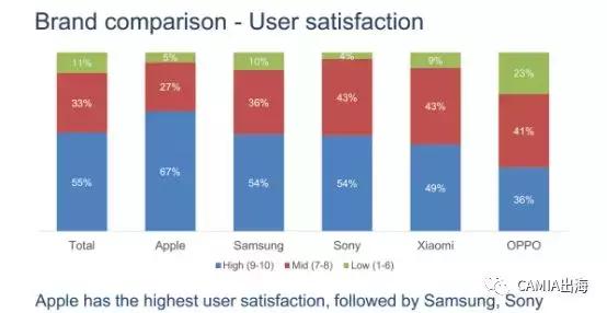在用戶滿意度方面,蘋果的用戶滿意度最高,其次是三星、索尼、小米、OPPO