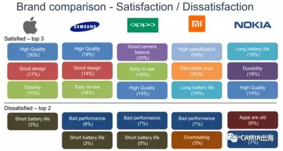 在品牌的不滿意/滿意因素方面,對(duì)蘋果滿意的主要因素是質(zhì)量好,不滿意的因素是電池續(xù)航差,對(duì)OPPO滿意的主要因素是拍照不錯(cuò),不滿意的因素是體驗(yàn)糟糕、電池續(xù)航差,對(duì)小米滿意的主要因素是性價(jià)比高,不滿意的因素是機(jī)身容易發(fā)熱。