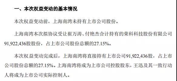 榮科科技公告表示,公司接到通知,公司實際控制人崔萬濤、付艷杰已經(jīng)簽署了《解除一致行動協(xié)議》。將合計持有的榮科科技9192.24萬股轉讓給上海南灣,占上市公司股份總額的27.15%,轉讓價格為10.88元/股,經(jīng)協(xié)商后合計總價10億元。上海南灣將成為上市公司控股股東,王迅及其一致行動人將成為上市公司實際控制人。