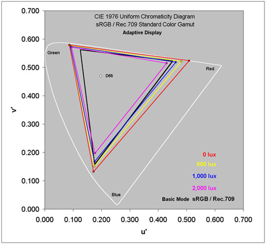 基本屏幕模式色彩精確度對(duì)大多數(shù)用戶來說非常重要,同時(shí)基本模式也是大多數(shù)移動(dòng)設(shè)備原廠提供日常使用模式,因?yàn)榇罅肯M(fèi)內(nèi)容都是基于sRGB/Rec.709色域,包括接收來自家人或朋友照片的顯示,還有大多數(shù)消費(fèi)類的電視節(jié)目、電影、體育賽事和在線視頻等等。色彩精確度越高,越能能夠呈現(xiàn)出最佳的色彩和最準(zhǔn)確的圖像效果。
