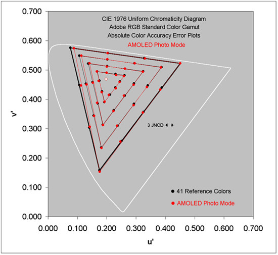 DisplayMate用專業(yè)先進(jìn)的光譜儀器,對(duì)Note 9屏幕每個(gè)色域和模式進(jìn)行了41個(gè)基準(zhǔn)顏色點(diǎn)(三角形內(nèi)的分層顯示了25%、50%、75%和100%的飽和度的顏色)的精確測(cè)試,并用自家的JNCD(Just Noticeable Color Difference,用來反映色彩偏移程度)單位作為評(píng)級(jí),評(píng)級(jí)數(shù)字越小代表著色彩偏差非常小,只要是小于5的數(shù)字眼睛就很少能夠差距色差,而小于3則表明幾乎無法直觀察覺偏差,眼睛對(duì)色彩看起來是完全準(zhǔn)確的。