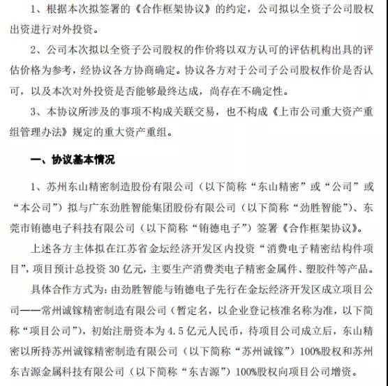 8月30日,勁勝智能再次發(fā)布公告表示,其將旗下6家公司整合為一家公司(勁勝精密電子),然后再通過勁勝智能與銪德電子在金壇開區(qū)內(nèi)投資30億建設消費電子精密結(jié)構件項目,隨后再引入東山精密!