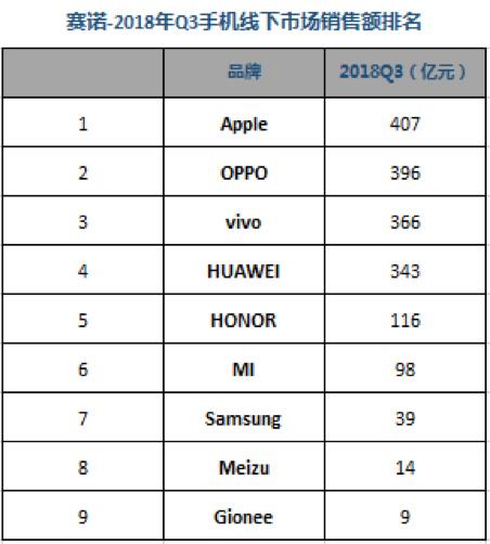 第三季度線下銷售額部分,蘋果407億元排名第一,二到四名分別為OPPO(396億)、vivo(366億)、華為(343億)。榮耀銷售額為116億元,位居國內(nèi)手機線下市場第五,超過小米和魅族線下銷售額之和,拿下互聯(lián)網(wǎng)手機第一。