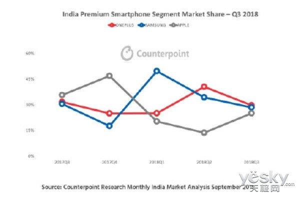 其中高端市場(chǎng)(價(jià)格在30000盧比以上,約合3000元人民幣),一加手機(jī)占據(jù)絕對(duì)主導(dǎo)地位,市場(chǎng)份額為30%(Q2為40%)。隨后緊跟著的是三星、蘋(píng)果,市場(chǎng)份額分別為28%、25%。