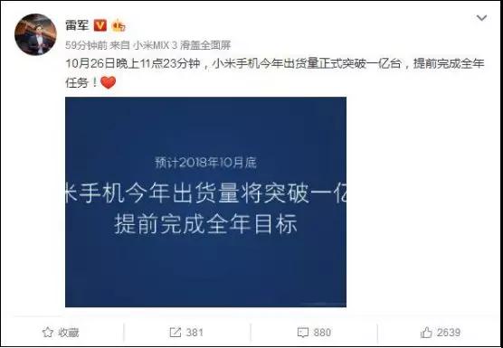 雷軍則在10月27日通過(guò)微博宣布,10月26日晚上11點(diǎn)23分鐘,小米手機(jī)今年出貨量正式突破一億臺(tái),提前完成全年任務(wù)。