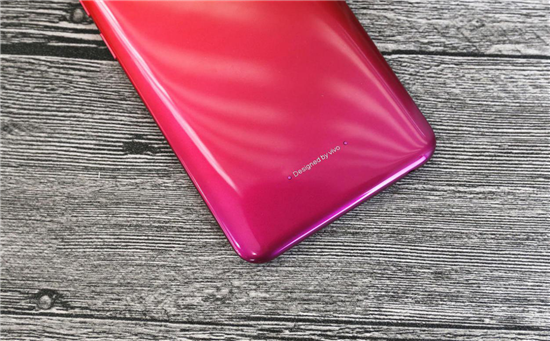 機(jī)身背面,vivo Y93為我們帶來了當(dāng)下最流行的漸變色設(shè)計(jì)。筆者手中的這臺,采用了深紅和紫紅搭配,兩種顏色由兩端向機(jī)身中部匯合,形成獨(dú)特的紅紫漸變色彩,看上去就像是夕陽西下的天空,萬里霞光,美不勝收。除此之外,其漸變色彩從不同的角度看還能呈現(xiàn)出別樣的光彩變幻,相當(dāng)靈動優(yōu)雅。